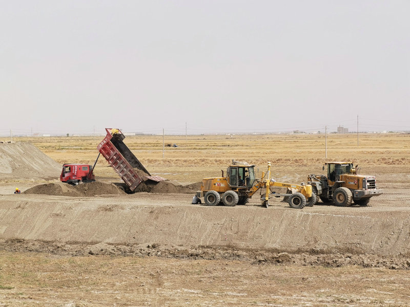 裝載機(jī)、壓路機(jī)、自卸車,等等,近二百輛施工車輛在且末站場往來穿梭,好不熱鬧。