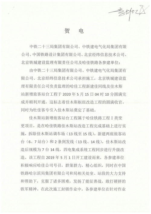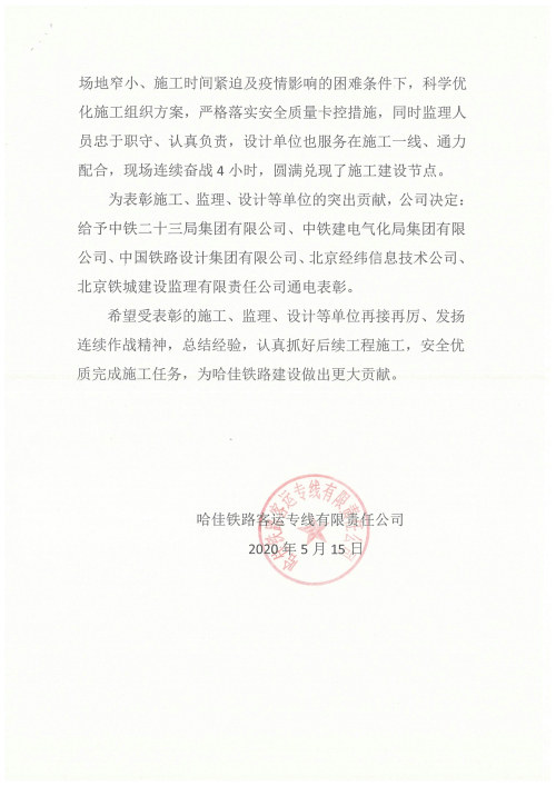5月15日,中鐵二十三局集團哈佳項目部喜獲哈佳鐵路客運專線有限責任公司所發(fā)賀電,通電表彰哈佳項目部承建的哈佳工程新建佳同線及佳木斯站新增旅客站臺工程順利開通。