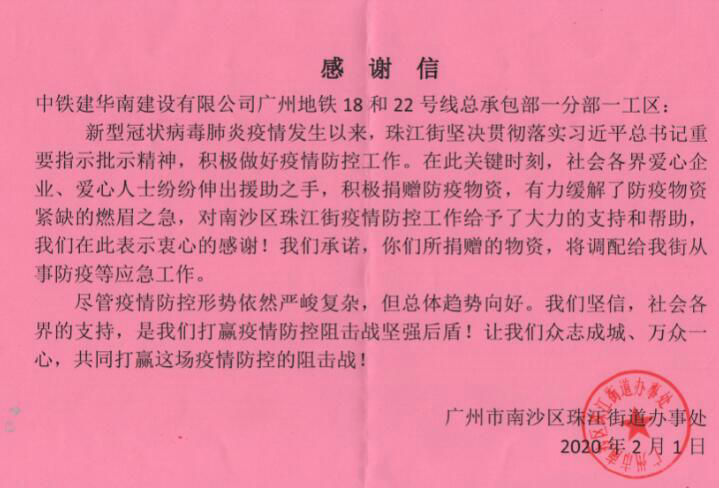(本站廣州消息,通訊員冉寧寧),在廣州市軌道交通十八和二十二號線工地上,中鐵建華南建設(shè)有限公司所屬一分部(中鐵十九局管段)一工區(qū)頻頻收到駐地政府和所在社區(qū)的感謝信,近日,該工區(qū)又收到了來自廣州市南沙區(qū)珠江街道辦事處的感謝信,感謝他們在疫情期間,主動向街道捐獻(xiàn)口罩、消毒液等防疫物資,較大舒緩了物資短缺的問題,同時一工區(qū)率先完成隔離區(qū)改造,而且以高度的政治自覺和強(qiáng)烈的行為擔(dān)當(dāng),不講條件,不論困難,主動參加珠江街設(shè)立的監(jiān)測點工作,以實際行動詮釋大國央企的社會責(zé)任與勇氣擔(dān)當(dāng),為珠江街打贏防控疫情的人民戰(zhàn)爭、總體戰(zhàn)、阻擊戰(zhàn)做出了重要貢獻(xiàn)。