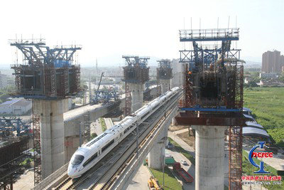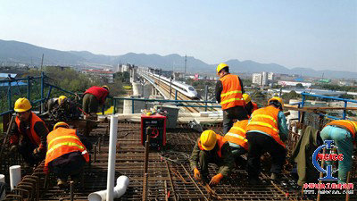 項(xiàng)目管段內(nèi)共有連續(xù)梁20聯(lián),其中北端鄰近營業(yè)線連續(xù)梁共有8聯(lián),且分布密集,從左側(cè)向右側(cè)依次為商合杭鐵路正線、北端下行聯(lián)絡(luò)線、合福高鐵、北端上行聯(lián)絡(luò)線,這在國內(nèi)是比較罕見的。8聯(lián)連續(xù)梁中距合福線水平距離最近處僅為4.77米,最高墩達(dá)37米(這相當(dāng)于12層樓高),在進(jìn)行連續(xù)梁吊裝施工時(shí),只能在商合杭鐵路正線和合福高鐵間20米到30米的狹窄區(qū)域內(nèi)進(jìn)行。此外8聯(lián)連續(xù)梁還跨越巢湖市區(qū)道路和高速公路出口,車流量大,安全風(fēng)險(xiǎn)極高,施工中稍有不慎,就會(huì)造成極其嚴(yán)重的交通堵塞及行車安全,這種復(fù)雜的施工情況在上海鐵路局范圍內(nèi)并無先例。 寸金難買寸光陰 每天通過北端鄰近營業(yè)線施工的高鐵列車為82車次,平均每12分鐘通過一趟。鑒于此,整個(gè)連續(xù)梁施工的主要工序都必須在夜間4小時(shí)天窗點(diǎn)內(nèi)完成,并要克服視線影響,難度增大,技術(shù)要求高等困難。施工至今已累計(jì)申請(qǐng)?zhí)齑包c(diǎn)125個(gè),平均每4天才能能申請(qǐng)1個(gè)天窗點(diǎn),可見天窗點(diǎn)時(shí)間多么寶貴。