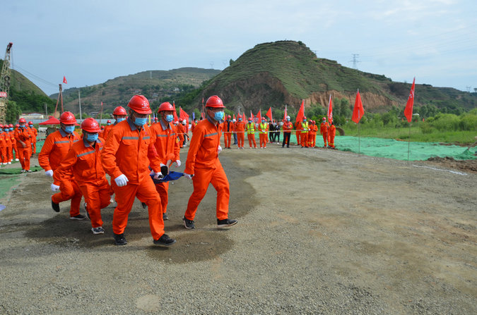 這是發(fā)生在由甘肅省公航旅等單位主辦,中鐵十五局集團(tuán)天莊總承包4標(biāo)項(xiàng)目部承辦的2020年甘肅省天莊高速公路安全應(yīng)急演練現(xiàn)場驚心動(dòng)魄的一幕。演練虛擬進(jìn)入6月主汛期以來,天莊項(xiàng)目所在區(qū)域連日普降暴雨。6月16日下午16:20分,清水縣氣象局發(fā)布暴雨紅色預(yù)警,項(xiàng)目公司防汛值班人員杜龍懷通知各參建單位加強(qiáng)現(xiàn)場隱患排查和值守工作。張政偉和項(xiàng)目安全總監(jiān)張徐接到通知后安排項(xiàng)目部防汛值班人員對施工現(xiàn)場進(jìn)行24小時(shí)值守,對現(xiàn)場的安全隱患進(jìn)行排查。整個(gè)演練活動(dòng)組織的井然有序,受傷人員的喊叫聲,演練總指揮、現(xiàn)場總指揮及政府應(yīng)急管理部門的應(yīng)急指揮,暴雨、洪水、建筑物的坍塌聲及現(xiàn)場解說員的適時(shí)解說,構(gòu)成了一幅人與自然奮力抗?fàn)?,搶險(xiǎn)救援的生動(dòng)畫卷。天莊高速公路建設(shè)、監(jiān)理、施工單位的代表及屬地張家川回族自治縣的有關(guān)領(lǐng)導(dǎo)及群眾400多人現(xiàn)場觀摩了整個(gè)演練過程。
