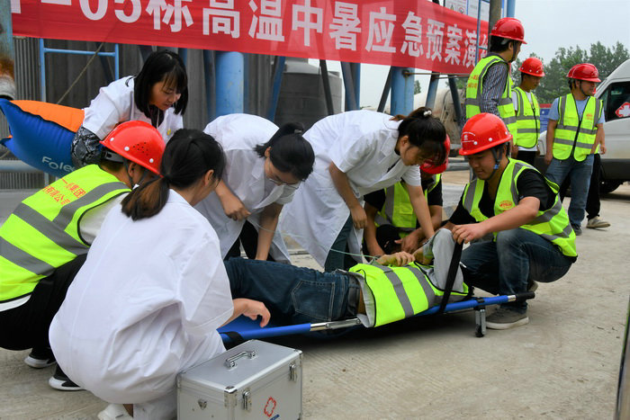 防中暑應急救援現(xiàn)場 此次演練活動模擬真實情景,現(xiàn)場各個環(huán)節(jié)有指揮有分工,一旦發(fā)生緊急情況,救援活動爭分奪秒時間就是生命。通過這次演練,進一步增強了現(xiàn)場施工人員安全意識和自救意識,熟悉夏季高溫中暑應急救援的程序、方法,達到了演練的預期目的。