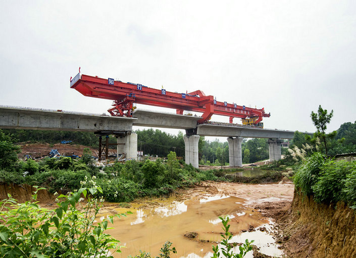 (圖片為黃黃高鐵蘄河特大橋16-17號(hào)橋墩166孔橋架設(shè)落梁畫面)