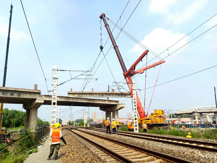 承擔(dān)施工任務(wù)的中鐵二十三局集團(tuán)二公司搶前抓早、精心組織,施工前結(jié)合現(xiàn)場實(shí)際,制定了嚴(yán)密的施工組織方案和應(yīng)急預(yù)案,對參戰(zhàn)人員進(jìn)行了既有線施工安全知識培訓(xùn)。組織專門力量對跨線孔箱梁提前切割分離,掃除影響施工障礙。同時調(diào)集一臺500噸和兩臺110噸重型液壓吊車,提前進(jìn)行荷載試驗(yàn),確保了準(zhǔn)備工作的萬無一失。在兩天的二級線路封鎖施工中,克服了高空跨線作業(yè)安全風(fēng)險疊加、電力接觸網(wǎng)林立、陰雨連綿等不利因素,嚴(yán)格標(biāo)準(zhǔn)化作業(yè)不走樣,把住箱梁吊裝、線路防護(hù)、吊車運(yùn)行關(guān),均安全正點(diǎn)開通線路,順利完成了7片箱梁的拆除任務(wù),為下步橋梁施工贏得了寶貴時間。