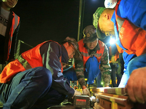 據(jù)中鐵一局鋪架項目負責人介紹,本次施工需舉全軍之力在300分鐘內(nèi)同時完成該站重(重慶)懷(懷化)兩端既有4組道岔拆除,插入軌節(jié)230m,拆安安全防護網(wǎng)800m,并完成該站材料工機具倒運、標識標志涂刷等系列施工任務。