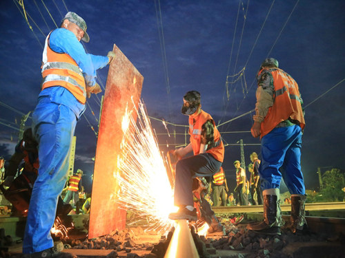 當天17時34分,隨著開工命令的下達,600余名工人在狹小的空間內(nèi)有序進行開斷鋼軌、拆除既有道岔施工,鏟車挖機在現(xiàn)場人員的指揮下爭分奪秒地進行破底清砟任務,隨后插入軌節(jié)連通線路、K車補砟、大機搗固養(yǎng)護、搭設安全防護隔離網(wǎng)等站改工序均按照既定計劃穩(wěn)步推進。