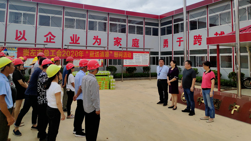 (廣西崇左訊)8月14日上午9時(shí),崇左市總工會(huì)黨組書記、常務(wù)副主席王雪寧一行到中鐵七局四公司崇左棚改二期項(xiàng)目開展送清涼慰問(wèn)活動(dòng),為一線農(nóng)民工送來(lái)涼茶等防暑降溫物品。王雪寧詳細(xì)詢問(wèn)了項(xiàng)目施工進(jìn)展情況和農(nóng)民工工作生活情況,囑托工友們?cè)谙募竟ぷ鬟^(guò)程中一定要注意防暑,要求崇左項(xiàng)目部一定要做好夏季施工預(yù)案,真正把清涼送到崗位,把關(guān)懷送到職工心坎上。