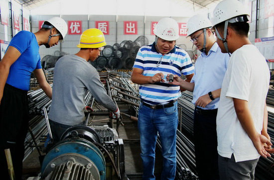 副總經(jīng)理兼總會(huì)計(jì)師郝敬豪(右二)與經(jīng)理王軍(中)、總工王亞輝(右一)在鋼筋廠檢查套筒加工質(zhì)量。 郝敬豪一行沿著全標(biāo)段10公里的線路,詳細(xì)檢查了四支河特大橋、鋼筋加工場、王家墕大挖方段九級(jí)高邊坡、楊家溝大橋、吳莊大橋、1號(hào)梁場、大井溝大橋、石灣大橋、張板崖大橋等工點(diǎn)。項(xiàng)目經(jīng)理王軍邊走邊匯報(bào)施工和安全質(zhì)量管控情況,看到工地現(xiàn)場火熱的大干氛圍,以及員工們高昂的斗志,郝總感到滿意,并對(duì)施工生產(chǎn)提出了要求。