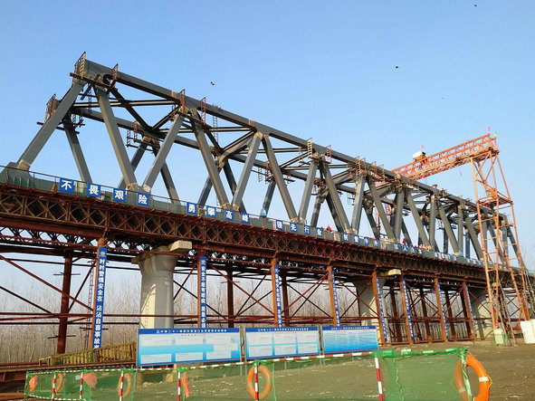 中鐵二十一局一公司承建的武漢新港江北鐵路全長(zhǎng)13871.74米的舉水河特大橋,為滿足長(zhǎng)江一級(jí)支流舉水河主河道通航凈空要求,跨河部分采取了鋼桁梁拼裝、頂推就位的施工方法。該橋1-96米鋼桁梁為下承式簡(jiǎn)支鋼桁梁,梁長(zhǎng)97.6米,梁體總重達(dá)824噸,鋼桁梁結(jié)構(gòu)復(fù)雜,工序繁多。