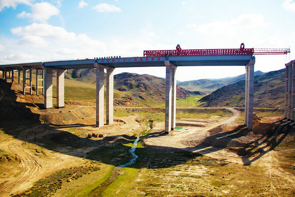 圖為京新高速項目疆內首座大跨度鋼板組合梁架設施工