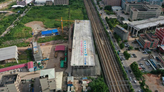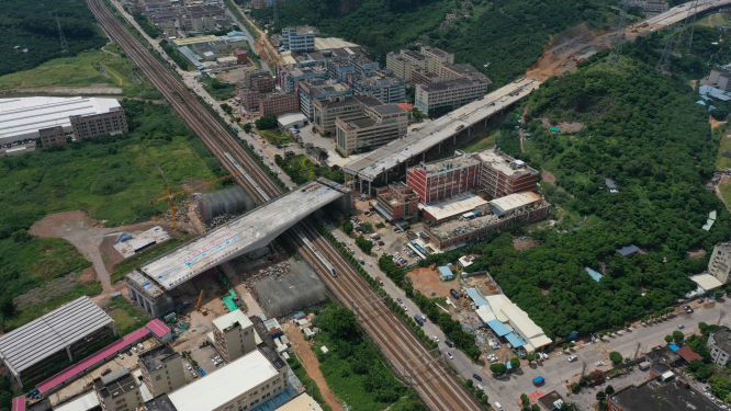 深圳外環(huán)高速公路,是廣東省“九縱五橫兩環(huán)”高速公路主骨架網(wǎng)中的重要組成部分,也是深圳市“七橫十三縱”高快速道路網(wǎng)重要“一橫”,線路全長(zhǎng)93.2公里,由深圳段75.8公里,東莞段17.4公里組成,雙向6車道。其中東莞段跨廣深鐵路橋梁采用水平轉(zhuǎn)體法施工,轉(zhuǎn)體橋長(zhǎng)165米,寬33米,轉(zhuǎn)體重量約為2.4萬(wàn)噸,相當(dāng)于約1.8萬(wàn)輛小汽車的重量,是東莞市首座轉(zhuǎn)體橋梁,刷新了廣東省和華南地區(qū)高速公路混凝土T型剛構(gòu)轉(zhuǎn)體橋橋面寬度、單轉(zhuǎn)跨度及單支座轉(zhuǎn)體重量三項(xiàng)紀(jì)錄,同時(shí)其轉(zhuǎn)體重量在全國(guó)已建轉(zhuǎn)體橋梁中排名第四。