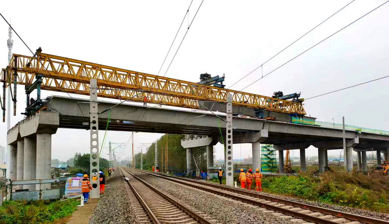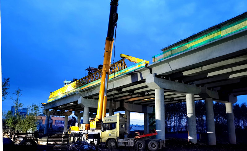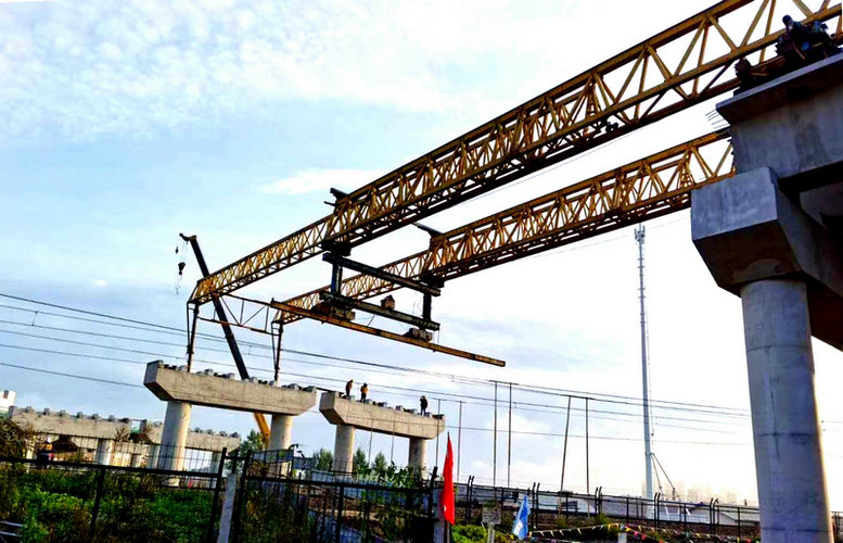該橋第12孔需要跨越既有濱綏鐵路架設(shè)8片箱梁,最大吊裝重量約 121噸,施工難度大,作業(yè)場地狹窄、安全風(fēng)險(xiǎn)高,為此,中國鐵路哈爾濱局集團(tuán)有限公司安排六次二級(jí)封鎖架梁施工。承擔(dān)施工任務(wù)的中鐵二十三局集團(tuán)二公司,為了確保安全萬無一失,采用了架橋機(jī)架梁的辦法,提前進(jìn)行安裝調(diào)試并順利通過了質(zhì)監(jiān)部門的驗(yàn)收。同時(shí),對(duì)施工技術(shù)標(biāo)準(zhǔn)和要求、安全、質(zhì)量控制措施進(jìn)行了詳細(xì)交底,做到任務(wù)部署、技術(shù)人員監(jiān)督、和安全措施保證到位。施工單位積極主動(dòng)與運(yùn)輸部門通力合作,克服清晨架梁施工,山區(qū)早晚溫差大、雨水頻繁等不利因素,嚴(yán)格按照封鎖計(jì)劃和施工方案有序組織施工,連續(xù)六天每天110分鐘的橋機(jī)過孔、箱梁架設(shè)二級(jí)封鎖施工均提前30至50分鐘完成,把施工對(duì)鐵路運(yùn)輸?shù)挠绊懡档搅俗畹停踩?、高效完成了跨線架梁施工任務(wù),為下步附屬工程施工贏得了時(shí)間。