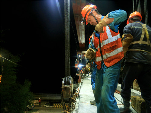 為有序確保該特大橋的架梁任務(wù)按照既定節(jié)點推進(jìn),項目部在搶時間,抓安全,保質(zhì)量的指導(dǎo)思想下,多次到現(xiàn)場進(jìn)行調(diào)研,并根據(jù)調(diào)研結(jié)果出具橋梁架設(shè)方案。同時在全面落實架梁安全技術(shù)交底制度的基礎(chǔ)上,制定了系列安全措施,持續(xù)強(qiáng)化施工現(xiàn)場的安全管理責(zé)任。架梁過程中,現(xiàn)場帶班領(lǐng)導(dǎo)與技術(shù)員、安全員全程跟班作業(yè),力保各項安全卡控制度落實到位。
