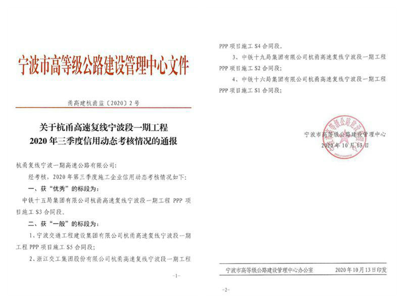 中國鐵路工程建設(shè)網(wǎng)寧波10月21日電(特約通訊員呂奎元) 10月21日,寧波市高等級公路建設(shè)管理中心發(fā)文通報杭甬高速復(fù)線寧波段一期工程三季度信用動態(tài)考核結(jié)果,中鐵十五局集團(tuán)公司杭甬項目獲優(yōu)秀單位稱號。