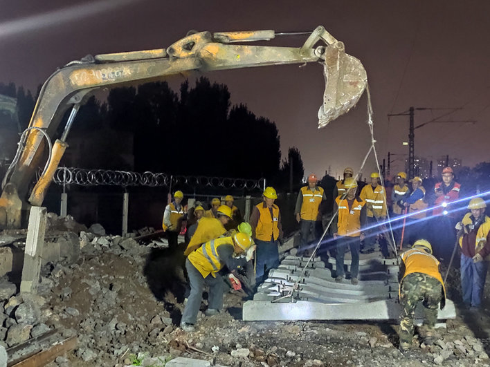當日晚上7時整,隨著京廣線上行封鎖命令的下達,施工現場人聲鼎沸、機械轟鳴,在項目部安全員和技術人員的嚴格盯控下,身著“黃馬甲”的作業(yè)人員揮舞著鐵鍬、鋼爬、風鎬等工具,拆除防護柵欄、清理線路、拆除既有線車擋片石、安裝臨時車擋、鋼軌合攏、填充道碴、搗固、膠接絕緣、軌道精調等各道工序緊密銜接,最終在封鎖點內完成新建專用線與安陽直通場南牽出線的鋼軌連接。