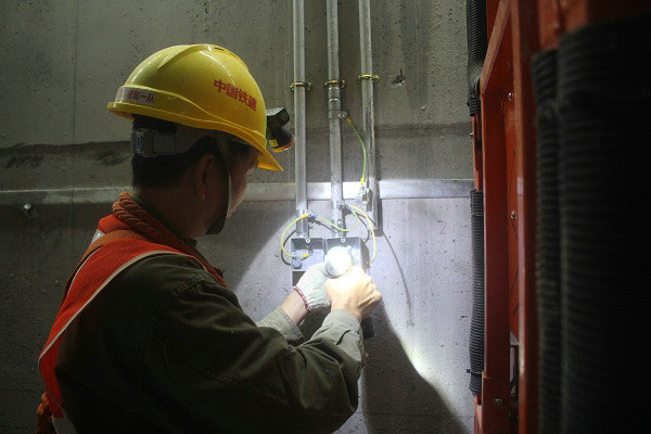 工人在番禺廣場(chǎng)站進(jìn)行動(dòng)力照明管線接線盒安裝作業(yè)