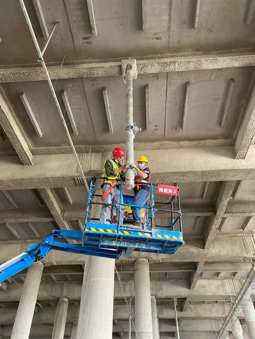 工人在進(jìn)行接觸網(wǎng)腕臂底座安裝作業(yè)