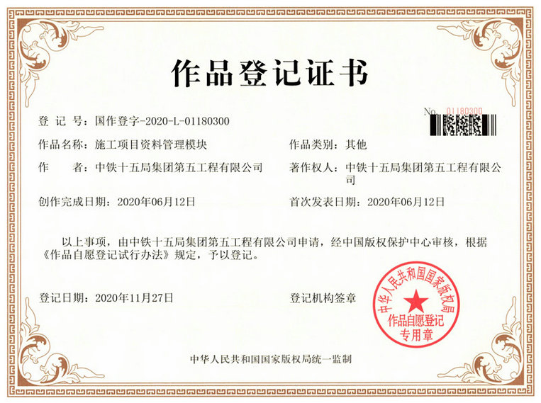 由中鐵十五局五公司組織編寫的《施工項(xiàng)目資料管理模塊》于近日通過中國(guó)版權(quán)保護(hù)中心審核,獲得由中華人民共和國(guó)國(guó)家版權(quán)局頒發(fā)的作品登記證書。這是該公司年內(nèi)獲得的第二個(gè)作品登記證書。