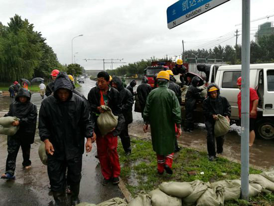 上午7時(shí)30分左右,正當(dāng)項(xiàng)目部人員在現(xiàn)場(chǎng)巡視、排查險(xiǎn)情時(shí),無情的暴雨再次來襲,導(dǎo)致汽車公園站圍擋外側(cè)凱達(dá)北街道路上積水上漲,8:30路面積水達(dá)1.0m左右,路面積水開始倒灌施工場(chǎng)地,危及基坑擋土墻,防汛領(lǐng)導(dǎo)小組立即從捷達(dá)大路站、汽車公園站調(diào)集120余人進(jìn)行搶險(xiǎn),另外,西湖站30余人用平板汽車將沙袋拉至自主大路與凱達(dá)北街交匯處進(jìn)行碼放,汽車公園站組織40余人裝沙袋并用裝載機(jī)倒運(yùn)沙袋至自主大路與凱達(dá)北街交匯處,其余人員在汽車公園站北門負(fù)責(zé)堆碼沙袋將周圍匯入的雨水引排至自由大路排水系統(tǒng)內(nèi),與此同時(shí),疏通汽車公園站東側(cè)道路上的排水系統(tǒng)、疏導(dǎo)交通、基坑變形監(jiān)測(cè)等其他各項(xiàng)工作均在同步進(jìn)行。