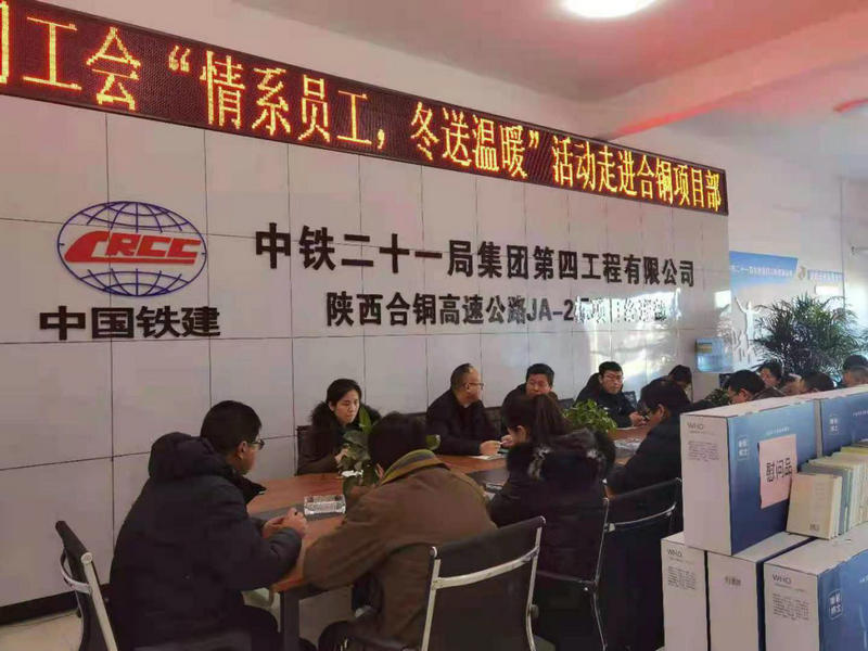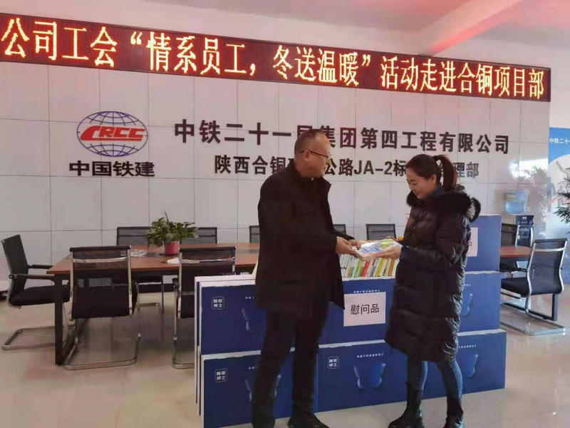 12月24日,中鐵二十一局四公司工會(huì)主席段榮福一行到陜西合銅高速公路JA-2標(biāo)項(xiàng)目部,為堅(jiān)守在一線的員工送上慰問品,并致以新春祝福和問候。