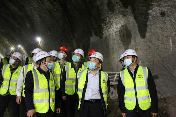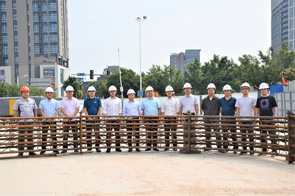 項目負責人中國鐵建股份公司總工程師雷升祥(右2),課題負責人中鐵十一局資深首席專家張旭東(左1)一行調(diào)研番禺廣場站施工現(xiàn)場