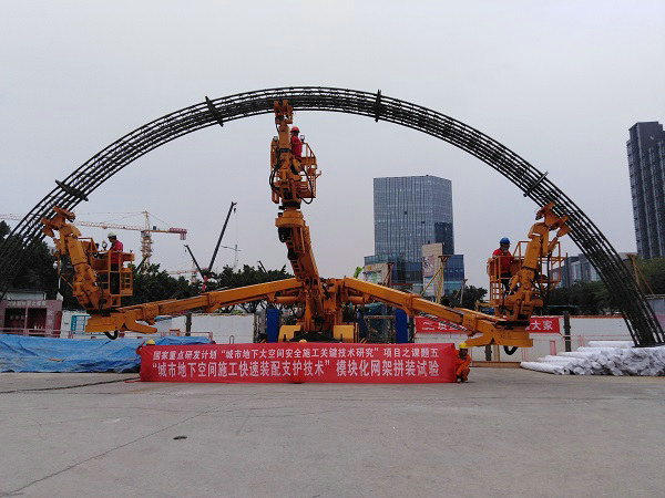 中鐵十一局集團作為“城市地下空間施工快速裝配支護技術”課題承擔單位,由課題負責人、中鐵十一局集團資深首席專家張旭東帶領技術中心、博士后工作站研發(fā)骨干及課題參與單位研究人員,多次深入施工現(xiàn)場,開展裝配支護理論、快速施工技術及配套施工裝備研究,揭示了淺埋暗挖快速裝配式支護結構,臨近掌子面的受力變形時空效應特征,提出了大剛度、模塊化網(wǎng)架面支護結構設計方法,研發(fā)了系列模塊化網(wǎng)架結構和快速連接接頭,研制了具有多方向自行走、重型構件抓舉、快速定位、精準拼裝功能的新型三臂多功能作業(yè)臺車,形成了快速裝配式支護成套技術,實現(xiàn)了巖體開挖后1.7小時內(nèi)形成面支護,迅速抑制圍巖變形,保障了地下空間施工安全。