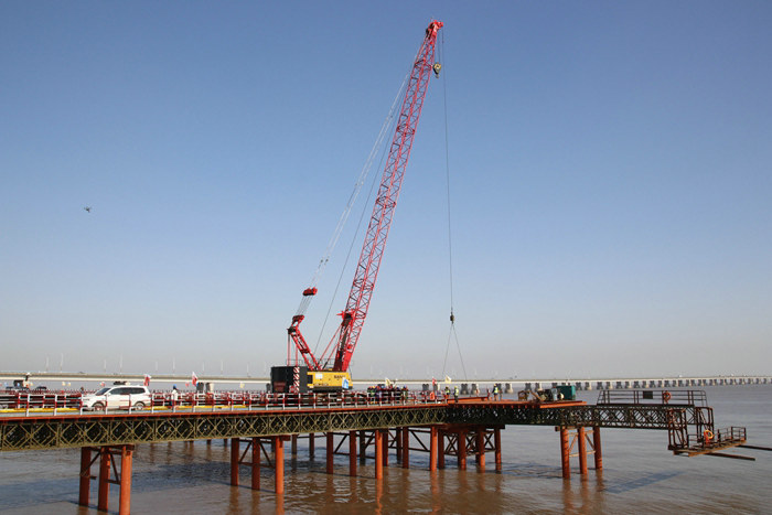 該公司采取棧橋先行,橋梁下部結(jié)構(gòu)緊隨的戰(zhàn)略推進(jìn)施工。為加快施工,該公司投入多支施工隊(duì)伍,100多臺(tái)履帶吊、汽車起重吊、鉆孔機(jī)等大型設(shè)備作強(qiáng)有力支撐。2020年8月份開工以來,將濱海高架和濱海互通作為施工難題中的重中之重去攻克,并根據(jù)進(jìn)度需求,增加隊(duì)伍和樁基隊(duì)伍,科學(xué)組織,晝夜作業(yè),截止今年1月1日,打入海下樁基796根,搭設(shè)鋼棧橋9269米、作業(yè)平臺(tái)116個(gè)基本滿足了插打鋼護(hù)筒、鉆孔機(jī)鉆孔泥漿反循環(huán),承臺(tái)、墩身施工和工程材料運(yùn)輸需要。