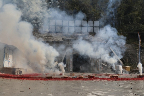 當(dāng)天上午10時(shí)許,陽(yáng)光明媚,風(fēng)朗氣清?;鸺t的“黨員先鋒隊(duì)”和“青年突擊隊(duì)”旗迎風(fēng)招展,格外耀眼。項(xiàng)目領(lǐng)導(dǎo)、管理隊(duì)負(fù)責(zé)人以及管理隊(duì)長(zhǎng)一行齊聚1號(hào)橫洞出口,舉行隆重的慶賀儀式。施工隊(duì)長(zhǎng)、管理六隊(duì)、管理七隊(duì)負(fù)責(zé)人分別作了表態(tài)發(fā)言,承諾將一如既往做好本職工作,為集團(tuán)公司、公司交上滿意答卷。