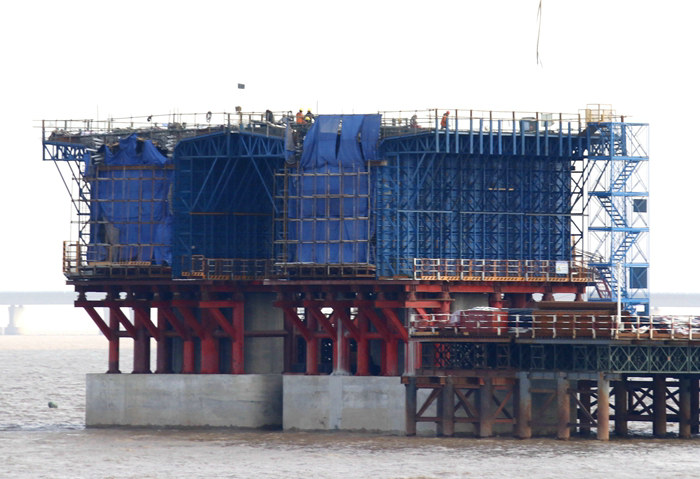 濱海高架橋全長4510米,上部結(jié)構(gòu)設(shè)計(jì)為8孔40米、77孔50米預(yù)制架設(shè)箱梁77.5米+135米+77.5米掛籃懸臂34塊現(xiàn)澆連續(xù)梁,海面與梁體凈空高度17.4米。下部采用鉆孔樁、承臺、花瓶墩結(jié)構(gòu),橋梁多次跨越污水管道、原油管道、給水通道、取水盾構(gòu)隧道、通訊光纜等17條管線,緊鄰化工區(qū),管線防破裂、防臺風(fēng)安全風(fēng)險高,施工難度大。在施工中,該項(xiàng)目部采取棧橋打頭陣,樁基和承臺緊隨其后的施工策略,嚴(yán)把每道工序質(zhì)量關(guān),筑牢海下結(jié)構(gòu)基礎(chǔ)。同時采取多種安全防護(hù)措施,安全跨越管線,以銅墻鐵壁般的質(zhì)量為連續(xù)梁上部結(jié)構(gòu)施工奠定了基礎(chǔ) 。