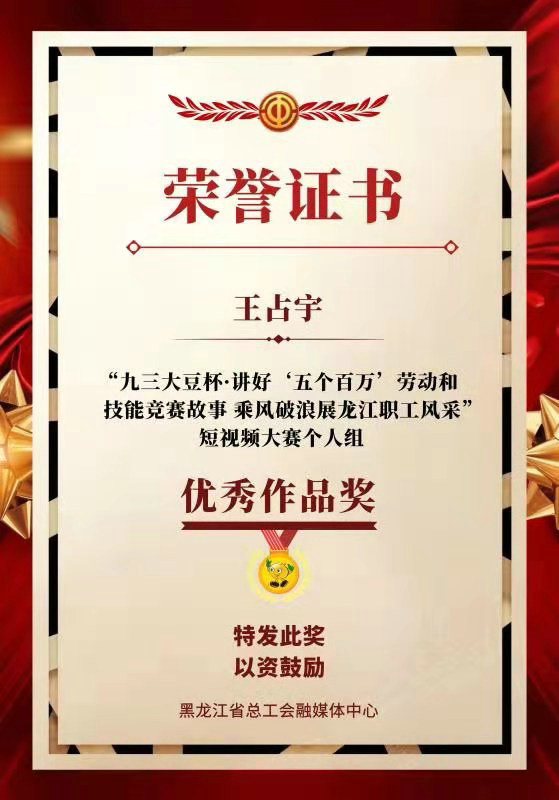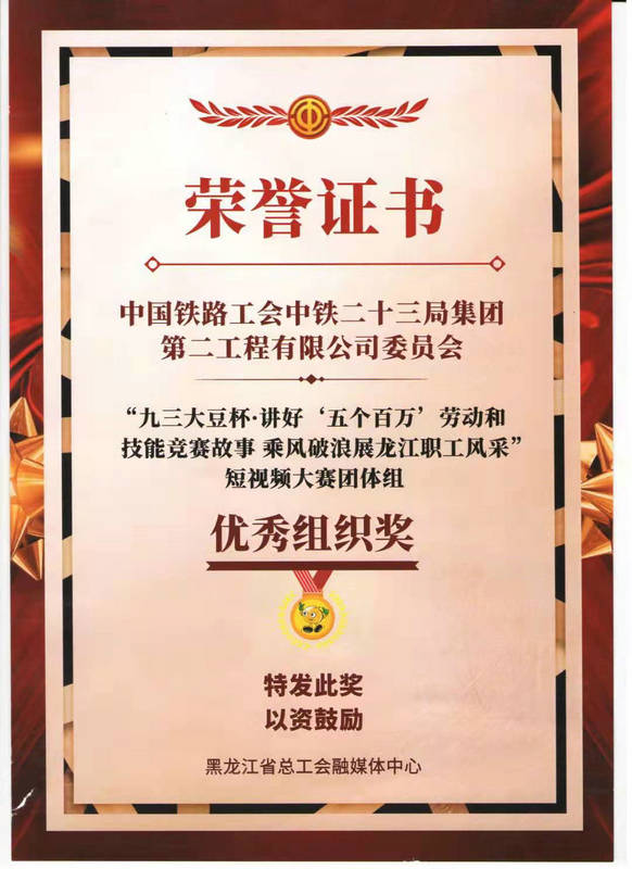 中鐵二十三局集團二公司工會高度重視,將此次全省工會系統(tǒng)的短視頻大賽,做為展示鐵建職工風采,提升工會組織影響力的難得契機。公司工會主席朱建國第一時間組織有關(guān)人員研究策劃參賽方案、征集視頻素材,各基層工會積極配合提供影像資料。公司工會工作部王占宇放棄星期天休息時間深入一線補拍鏡頭,用心用情精心編撰打磨作品。其拍攝的《建功新龍江、鐵建展風采》短視頻,再現(xiàn)了公司管內(nèi)鐵路、公路、房建等各專業(yè)重點工程勞動競賽的精彩瞬間。作品主題鮮明、形式新穎、生動感人,在百余件參賽作品中脫穎而出榮獲優(yōu)秀作品獎。