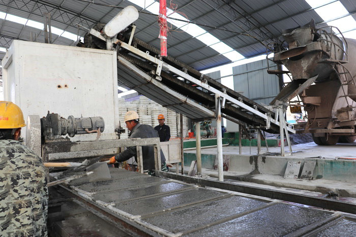 圖為生產(chǎn)混凝土預(yù)制構(gòu)件 為了加快推進(jìn)砼預(yù)制構(gòu)件任務(wù)的完成,項(xiàng)目部春節(jié)期間不放假,充分做好穩(wěn)崗留工,堅(jiān)守崗位,現(xiàn)場(chǎng)技術(shù)人員同勞務(wù)隊(duì)大膽開(kāi)展創(chuàng)新工藝,小革新小發(fā)明,自主加工制作砼預(yù)制生產(chǎn)流水線,并通過(guò)反復(fù)摸索試驗(yàn)與技術(shù)總結(jié),制成全自動(dòng)成型一體機(jī),主要由模塊砼灌裝定位,自動(dòng)振動(dòng)平臺(tái),自動(dòng)液壓裝卸平臺(tái),生產(chǎn)過(guò)程中流水線替代了人工生產(chǎn)模式,避免了預(yù)制過(guò)程中因人工填料導(dǎo)致砼量不易控制以及振搗不均勻的現(xiàn)象,即節(jié)約了人工,又杜絕人工脫模對(duì)預(yù)制構(gòu)件的破損,為打造“品質(zhì)工程”提供了平臺(tái)。在工藝上力求精益求精,保證構(gòu)件出模后內(nèi)實(shí)外美,平整光潔,同時(shí)在生產(chǎn)過(guò)程中不斷優(yōu)化工序,邊實(shí)踐邊改進(jìn)工藝,各流水平臺(tái)作業(yè)配合順暢,力爭(zhēng)達(dá)到最佳。采用預(yù)制小型構(gòu)件機(jī)械化流水線作業(yè),達(dá)到每8小時(shí)灌裝預(yù)制200多方砼,比人工生產(chǎn)提升工效30多倍。通過(guò)蒸汽養(yǎng)護(hù),成形快,模具周轉(zhuǎn)期大大縮短,不但提高工效,降低成本,而且減少對(duì)人工的依賴(lài),施工更為高效,質(zhì)量更穩(wěn)定,光潔度成品率達(dá)到100%。
