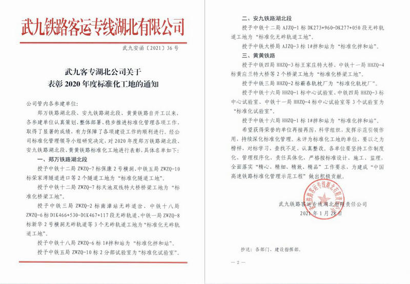 湖北黃岡訊 隨著春節(jié)的臨近,黃黃鐵路建設(shè)接連傳來(lái)好消息。自1月28日擔(dān)負(fù)黃黃鐵路建設(shè)任務(wù)的中鐵三局線橋公司項(xiàng)目部收到武九鐵路客運(yùn)專線湖北有限公司發(fā)來(lái)“關(guān)于表彰2020年度標(biāo)準(zhǔn)化工地”的通知,蘄春軌枕廠被評(píng)為“標(biāo)準(zhǔn)化軌枕廠”。2月1日再次收到該公司發(fā)來(lái)的賀電,賀電稱:值此黃黃鐵路建設(shè)攻堅(jiān)之際,由貴公司承建的黃黃二標(biāo)順利完成545榀箱梁架設(shè)任務(wù),成為全線首個(gè)完成箱梁架設(shè)任務(wù)的施工單位,為緊隨其后的軌道工程施工提供了有力保障,特向貴公司及黃黃二標(biāo)全體參建員工表示熱烈的祝賀!