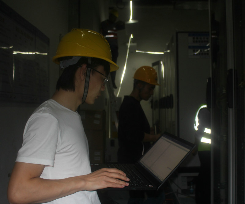 五工區(qū)技術(shù)人員在番禺廣場站機房調(diào)試設(shè)備