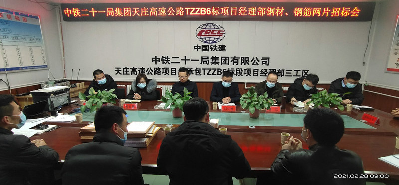 2月28日, 中鐵二十一局四公司天莊高速公路項(xiàng)目部組織召開了鋼材、鋼筋網(wǎng)片物資采購招標(biāo)會,本次招標(biāo)共分為2個(gè)包件,鋼材、鋼筋網(wǎng)片各一個(gè)包件,共有6家單位參與了本次招標(biāo)會。甘肅省公航旅天莊項(xiàng)目公司紀(jì)檢科的領(lǐng)導(dǎo)、天莊項(xiàng)目3標(biāo)監(jiān)理試驗(yàn)室主任、公司總部物資設(shè)備部部長、項(xiàng)目部全體領(lǐng)導(dǎo)及相關(guān)工作人員參加了招標(biāo)會。