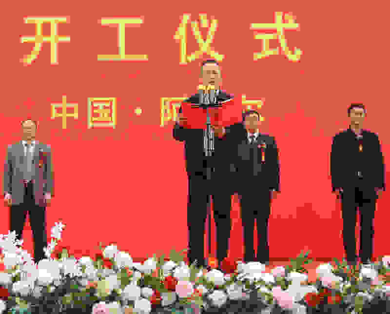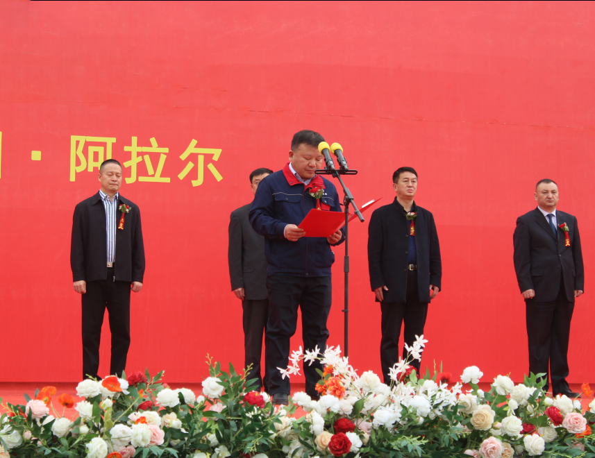 圖為新疆生產(chǎn)建設(shè)兵團(tuán)第一師阿拉爾市黨委書記、政委盧躍東為開工儀式致辭