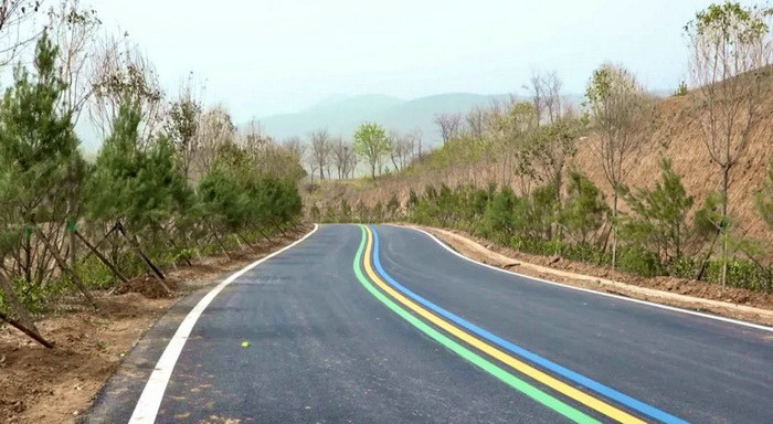 圖為線形規(guī)整的彩色標線瀝青路面 目前,第九標段路基、路面、安防工程已全面完工,道路綠化、安全防護工程正在持續(xù)推進中,沿黃生態(tài)廊道建設工程項目經(jīng)理部按照業(yè)主要求調(diào)配機械、組織人員做好施工現(xiàn)場清障掃尾工作,確保生態(tài)廊道其他標段按期完工。