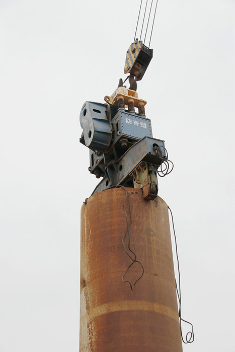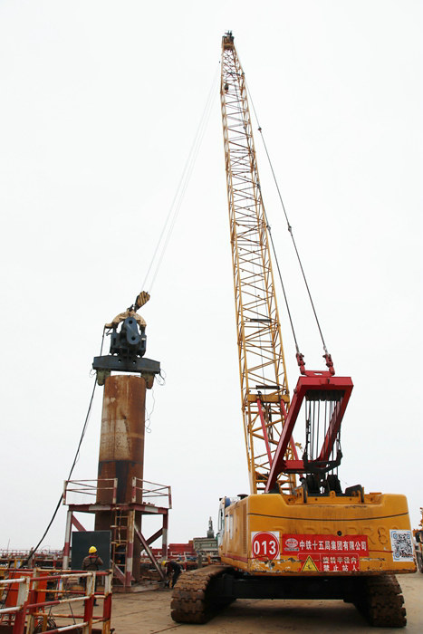 在做好前提準(zhǔn)備工作的同時,該項目部進(jìn)行搭設(shè)棧橋作業(yè),只有搭設(shè)好棧橋,具備了條件,方可投入樁基施工。于是幾個棧橋隊緊鑼密鼓地不分晝夜地打樁、焊接、安裝棧橋。項目部又接著通過公開招標(biāo)形式,錄用4支樁基隊投入施工。在樁基施工中,樁基隊在技術(shù)人員指導(dǎo)下,將位于棧橋作業(yè)平臺樁基位置切割成標(biāo)準(zhǔn)的圓形窟窿,然后操縱履帶吊,由自重10多噸的振動錘“咬住”厚度為1.2厘米的鋼護(hù)筒向下振插,每12米一截,打下一截再焊接另一截,依次推進(jìn)。在打插過程中若有偏移,馬上矯正,確保打入海底98米位置的鋼護(hù)筒準(zhǔn)確無誤。鋼護(hù)筒完成后,由樁基隊進(jìn)行泥漿反循環(huán)鉆孔作業(yè)。鉆孔施工可不簡單,進(jìn)場鉆頭鉆到堅硬巖層,上面只見連接管旋轉(zhuǎn),半天不見進(jìn)尺,著急也沒用,沒有更好的辦法,只能耐心地等,直到鉆到98米深才罷休。