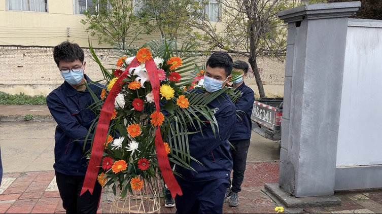上午十一時,烈士陵園松柏蒼翠,氣氛肅穆。大家在進入革命烈士陵園前,四名預(yù)備黨員抬著花籃,邁著沉重的步伐,向革命烈士敬獻花籃。由黨支部書記高豐收和項目經(jīng)理時愛雷整理綬帶,以表達對革命先烈的緬懷之情。全體人員在革命烈士陵園前肅立、默哀三分鐘。大家向長眠于此的烈士獻出手上的鮮花,并深深的三鞠躬,表達無限的哀思和崇高的敬意。