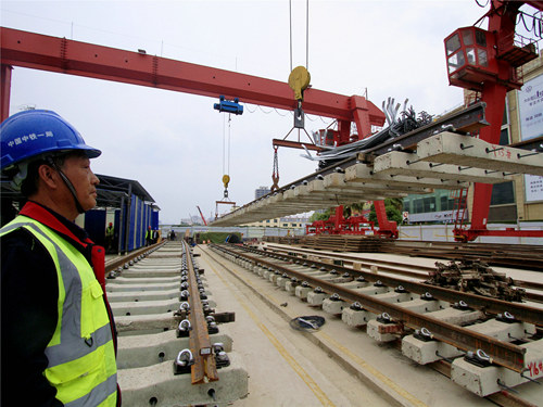 期間,為確保鋪軌工作按工期節(jié)點順利推進,項目部提前對施工現(xiàn)場及線路條件進行勘察,根據(jù)勘察結(jié)果有針對性地編制施工方案,制定切實可行的施工進度計劃;同時現(xiàn)場人員做好設(shè)備操作及維護等培訓,不斷細化責任分工,將安全責任落到實處。在軌排拼裝、吊運、鋪設(shè)、混凝土澆注等環(huán)節(jié)中,項目部還指定專人聯(lián)合作業(yè)隊對各工序工法進行反復(fù)推敲計算,力求最大化的節(jié)省時間,提高施工效率,系列舉措為鋪軌施工的全面開展提供了強有力的技術(shù)保障。