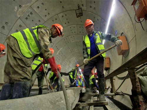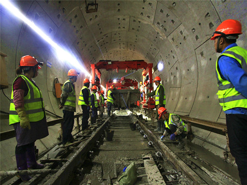 據(jù)中鐵一局軌道項目部負責人介紹,該條地鐵正線鋪軌工程均采用“軌排架軌法”施工工藝進行施工,即在鋪軌基地內(nèi)將25米長鋼軌、軌枕、扣件等組裝成軌排,用門式起重機吊裝到地下隧道內(nèi)地鐵專用平板車上,頂送到作業(yè)現(xiàn)場。之后,再由鋪軌門吊將軌排吊鋪到位,通過調(diào)整軌道幾何尺寸、澆筑混凝土等工序,使之形成整體道床軌道。最后利用移動式閃光焊焊軌機現(xiàn)場將鋼軌焊接成無縫線路,并實現(xiàn)全線長軌通。