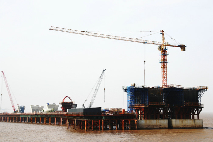 杭甬項目濱海高架跨輸油管135米連續(xù)梁,邊中跨比為0.574,主梁采用上下行方向分幅布置。橋梁起點樁號為K35+240,終點樁號為K35+530,其中K35+240.000-K35+296.441位于直線第一跨半徑為6000米的圓曲線上。橋梁為雙向2%橫坡,大跨橋上部結(jié)構(gòu)采用變截面預(yù)應(yīng)力混凝土連續(xù)梁,采用掛籃對稱懸臂澆筑施工方案,下部結(jié)構(gòu)為實心片墩加鉆孔灌注樁基礎(chǔ)。墩與主梁之間設(shè)置減隔震支座。主梁采用單箱單室變梁預(yù)應(yīng)力混凝土箱梁直腹板。箱梁底板下緣保持水平。單幅箱梁頂板寬16.3米,底板寬7.3米。跨中梁高3.2m,根部梁高8.5米??缰械装搴?0cm,根部底板厚90厘米,按拋物線過渡。主墩處主梁設(shè)置3米厚中橫梁,過渡墩頂處設(shè)置2.3米厚端橫梁。左幅為混凝土連續(xù)澆注,混凝土方量為450立方,12小時連續(xù)澆注。同時,梁面周邊設(shè)置1.2米防護欄,并掛密目網(wǎng),下設(shè)從地面通向頂部可供施工人員上下的“樓梯”式踏腳板。為保證施工的順利進行,項目部邀請寧波海事局、中石油寧波分公司有關(guān)專家準確查找直徑4.5米的輸油管道,位置確定后,組織技術(shù)公關(guān)小組查閱資料、反復(fù)研討論證,并由工程部編寫施工方案。經(jīng)過技術(shù)人員近白天的艱苦奮戰(zhàn),長達169頁的濱海高架橋跨輸油管135米連續(xù)梁施工技術(shù)方案初稿出籠,經(jīng)業(yè)主組織的各方專家評審,項目部結(jié)合專家的意見,最后拿出的方案一致通過專家評審。項目部按照方案緊鑼密鼓地進行施工,每一道工序都經(jīng)監(jiān)理嚴格檢查并簽字認可。在完成樁基、承臺、支座、支架安裝預(yù)壓、綁扎鋼筋籠、穿張拉預(yù)應(yīng)力鋼絞線、立模等幾十道復(fù)雜的工序完成后,正式進入混凝土澆筑施工。從昨天下午1點到今天下午1點,連續(xù)24個小時晝夜作業(yè),終將0號塊左幅順利澆注完畢。