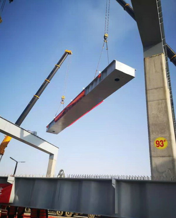為保證首跨鋼箱梁順利架設(shè),該項(xiàng)目編制并完善鋼箱梁架設(shè)施工方案,多次調(diào)查商討現(xiàn)場施工細(xì)節(jié),排查運(yùn)輸線路安全隱患,召開鋼箱梁架設(shè)施工部署專題會,多措并舉、多管齊下、多方合力確保鋼箱梁架設(shè)施工順利進(jìn)行。同時(shí),鋼箱梁架設(shè)施工過程中,項(xiàng)目管理辦公室主任張?jiān)Z、T3-4項(xiàng)目負(fù)責(zé)人王亞鋒帶領(lǐng)班子成員密切關(guān)注施工動態(tài),合理安排施工組織,盯控鋼箱梁架設(shè)過程;安全管理人員疏導(dǎo)施工車輛,確保施工通道交通順暢,現(xiàn)場技術(shù)員指揮吊車位置、吊梁順序、落梁點(diǎn),保證梁體縱坡及橫坡準(zhǔn)確,一次安裝到位。項(xiàng)目管理人員協(xié)同聯(lián)動、施工作業(yè)人員積極配合,架梁工作有條不紊,順利進(jìn)行。首跨鋼箱梁于當(dāng)天上午8點(diǎn)28分開始架設(shè),僅用時(shí)5小時(shí)架設(shè)成功。