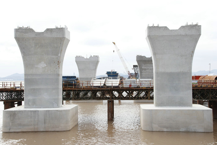 鐵路工程建設網訊(特約通訊員呂奎元)截至5月11日,經過中鐵十五局集團廣大職工辛勤努力,杭甬高速復線寧波段一期S3合同段110座挺拔的橋墩魏然屹立于海上,主體工程完成過半。該項目傲然挺立于海上的110座高度為12米左右的橋墩,成為是一道亮麗的風景線,吸引了前來檢查指導工作的業(yè)主、監(jiān)理的目光,對親手建造橋墩的