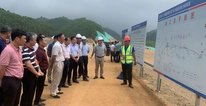 圖為南寧市政協(xié)領(lǐng)導(dǎo)聽取工程情況介紹 陳平互通距賓陽南樞紐立交14.49公里,主要工程包括:主線橋梁三座、匝道橋梁四座,共計全長1792米;涵洞四座;土石方挖方237.7萬方;土石方填方208.8萬方。設(shè)置一處收費站,收費站規(guī)模2進2出。工程概算總造價3.23億元。2020年8月15日開工。目前路基、橋梁樁基基本完成,橋梁墩柱和預(yù)制梁片施工正全面展開。開工累計完成投資2.68萬元,占總投資82.9%。