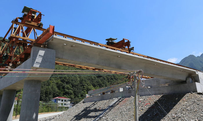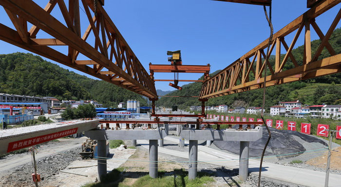 上午11時(shí)18分,天空艷陽高照,南江河兩岸一片翠綠的山體被映襯得格外美麗。當(dāng)長30米,重約80噸的箱梁在架橋機(jī)牽引下,即將落在58號橋臺和57號橋墩上時(shí),現(xiàn)場喜慶的禮花沖天而起,爆竹聲響成一片,慶祝鐘寶特大橋首片箱梁架設(shè)成功。