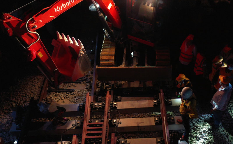 黃岡西站站改道岔技術(shù)人員確認(rèn)龍口就位