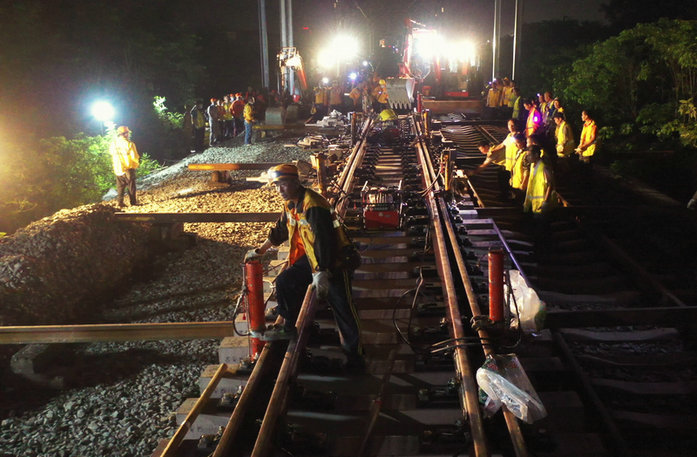 為確保武岡城際鐵路營業(yè)線黃岡西站道岔順利插鋪施工,中鐵三局線橋公司黃黃項(xiàng)目部積極響應(yīng)武九客專湖北公司有關(guān)營業(yè)線施工安全、質(zhì)量及技術(shù)要求,提前數(shù)月進(jìn)行鐵路局各站段簽署各種施工安全協(xié)議、線路預(yù)鋪、道岔預(yù)鋪、配合工務(wù)部門站改信號過渡施工,換裝新的LKJ基礎(chǔ)數(shù)據(jù)等準(zhǔn)備工作。先后召開5次營業(yè)線道岔插鋪施工準(zhǔn)備會,成立技術(shù)、安全、防護(hù)、機(jī)械、施工等5個小組,提前對道岔位置、撥接長度、線路標(biāo)高等技術(shù)資料反復(fù)核對,對現(xiàn)場防護(hù)作業(yè)人員進(jìn)行全員培訓(xùn),制定站改專項(xiàng)施工方案、應(yīng)急預(yù)案并經(jīng)多次論證確定最終方案。施工時線橋公司副總經(jīng)理王亮明帶領(lǐng)公司工程技術(shù)開發(fā)部、安質(zhì)部等相關(guān)部門專家進(jìn)行現(xiàn)場盯控指導(dǎo),確保站改施工萬無一失,準(zhǔn)時消點(diǎn)開通。