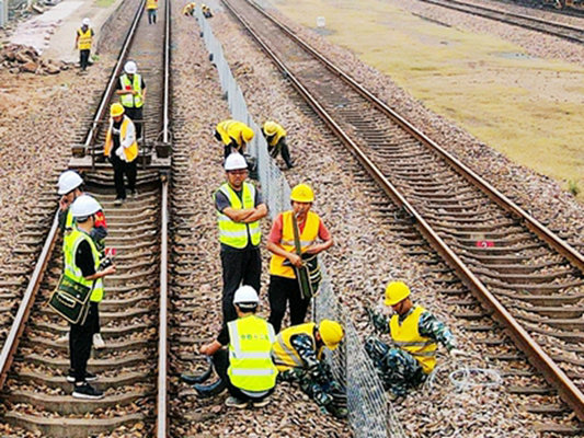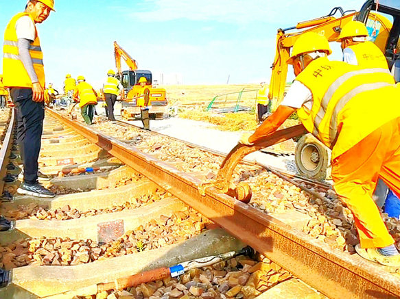 鐵路工程建設(shè)網(wǎng)江蘇江陰訊(特約通訊員 鄭建軍 攝影報道)新建江蘇南沿江城際鐵路西起南京南站,途經(jīng)南京江寧區(qū)、秦淮區(qū),鎮(zhèn)江句容市,常州金壇、武進(jìn)、經(jīng)開區(qū),無錫江陰市,蘇州張家港、常熟、太倉市,終至太倉站,設(shè)計時速350公里,新建線路南沿江正線長度278.530公里,江寧聯(lián)絡(luò)線5.312公里,太倉聯(lián)絡(luò)線7.181公里。中鐵十二局集團(tuán)南沿江城際鐵路項目部鋪軌分部負(fù)責(zé)全線572.95公里的鋪軌施工,還有站線31.975鋪軌公里,道砟22.6萬方,道岔123組(其中85組無砟道岔,38組有砟道岔)。目前,隨著梁下工程的推進(jìn)和架梁通道的暢通,鋪軌工作也提上了日程。據(jù)鋪軌分部現(xiàn)場負(fù)責(zé)人劉潤俊、李國福介紹:江陰站鋪軌基地從既有江陰站1道接軌,并停運(yùn)作為工程線使用,所以必須在封鎖點(diǎn)內(nèi)完成I、II道之間870米防護(hù)網(wǎng)片安裝、300根鋼筋立柱釘立及混凝土澆筑、拆除1道股道內(nèi)兩段合計62.5米軌道,更換既有1道14號岔后50米鋼軌,并在K424+359.3處設(shè)置臨時車檔等施工內(nèi)容,為保證此次施工安全快速的完成,項目部投入大量人力,共分7組同時施工,最終順利完成相關(guān)任務(wù)。待鋪軌基地順利驗收后,將盡快投入南沿江鐵路的長鋼軌進(jìn)場、存放和鋪軌程序。