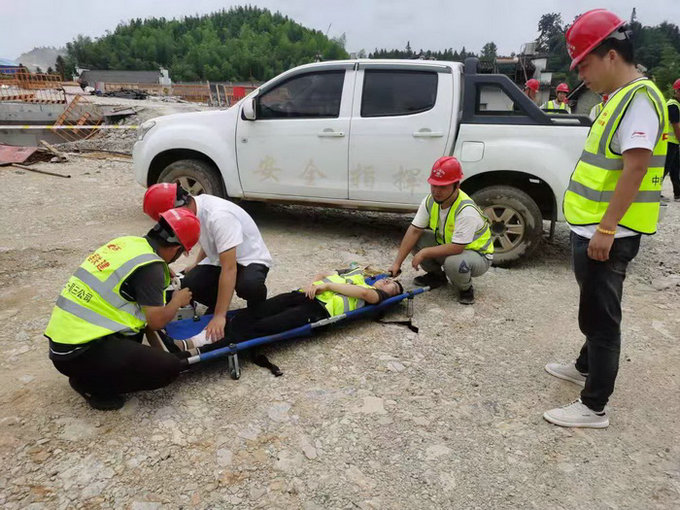 演練開(kāi)始前,項(xiàng)目部安全總監(jiān)宋吉平向各應(yīng)急救援小組宣講了演練科目和注意事項(xiàng)。演練現(xiàn)場(chǎng)分為:事故調(diào)查組、應(yīng)急保衛(wèi)組、應(yīng)急通訊組、應(yīng)急救護(hù)組、應(yīng)急搶險(xiǎn)組五個(gè)小組,當(dāng)應(yīng)急救援總指揮接到現(xiàn)場(chǎng)安全員有人墜落的突發(fā)事件時(shí),隨著現(xiàn)場(chǎng)應(yīng)急總指揮一聲令下,應(yīng)急救援演練正式開(kāi)始,各小組立即趕赴現(xiàn)場(chǎng),通訊組立即電話通知各應(yīng)急救援小組,各小組接到通知后,分頭行動(dòng),救援小組第一時(shí)間到達(dá)現(xiàn)場(chǎng),應(yīng)急保衛(wèi)組將現(xiàn)場(chǎng)封閉警戒拉上警戒隔離帶,疏散過(guò)往車輛人員,急救組立即將傷員抬到擔(dān)架上并對(duì)傷員進(jìn)行搶救包扎處理傷口,同時(shí)立即將傷員抬到安全指揮車輛送往醫(yī)院救治。