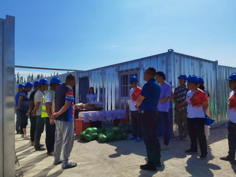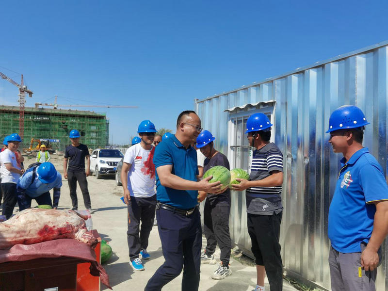 6月30日,中鐵二十一局四公司工會主席段榮福到塔里木職業(yè)技術學院項目部開展“夏送清涼”慰問活動,為奮斗在一線的施工人員送去了防暑降溫慰問品,總部工會工作部部長陪同慰問。